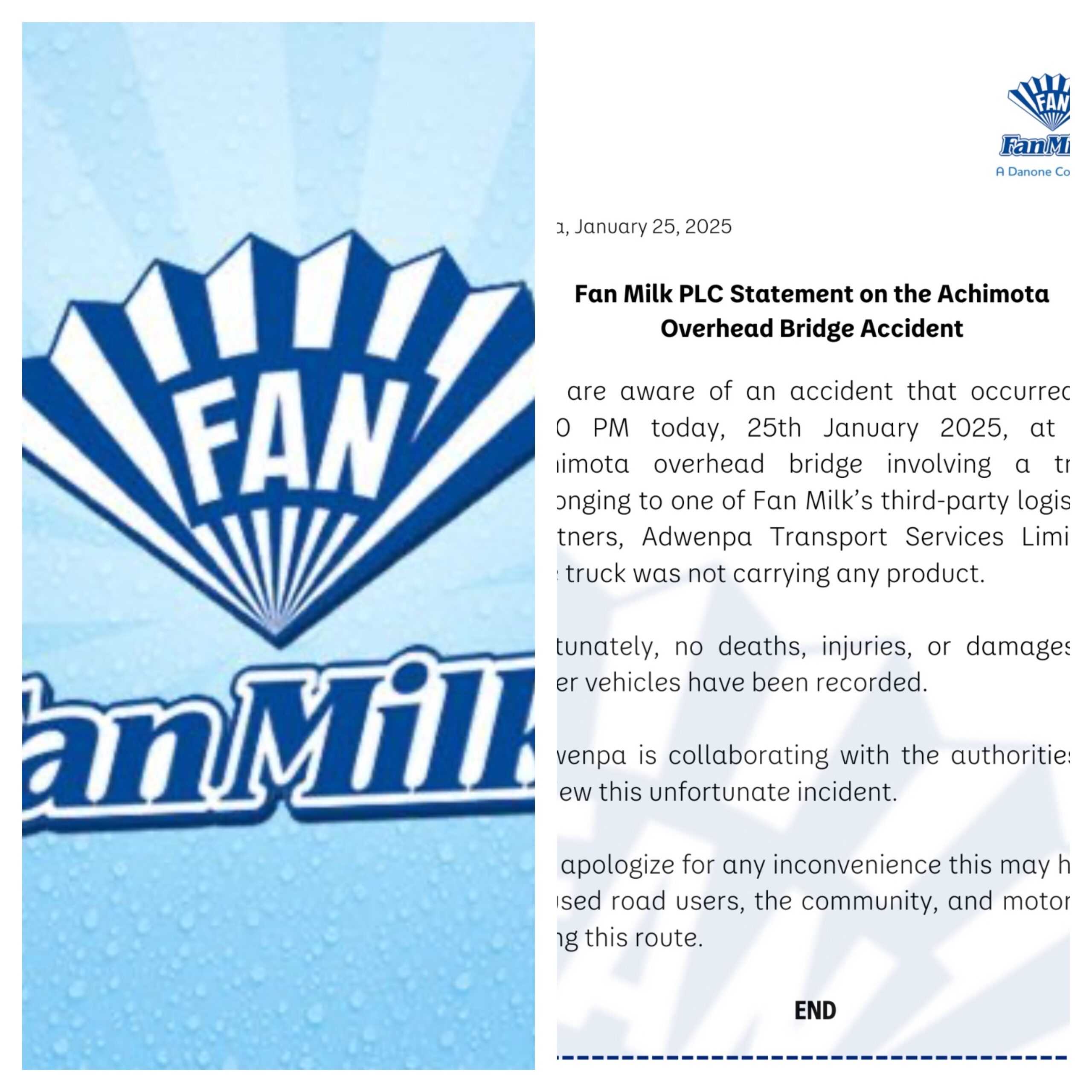 Fan Milk apologises for traffic disruption after truck accident on Achimota-Tesano overhead bridge