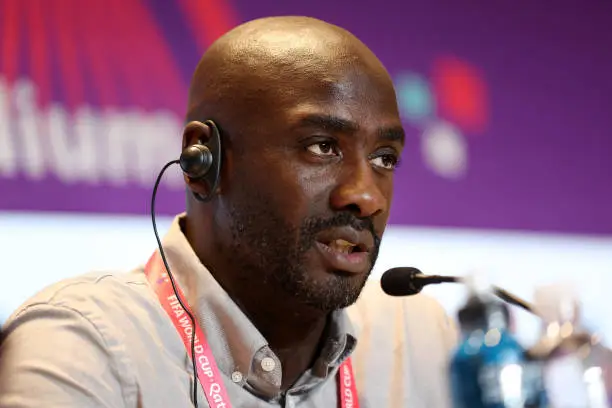 AL WAKRAH, QATAR - DECEMBER 02: Otto Addo, Head Coach of Ghana, speaks to the media in the post match press conference after the team's defeat during the FIFA World Cup Qatar 2022 Group H match between Ghana and Uruguay at Al Janoub Stadium on December 02, 2022 in Al Wakrah, Qatar. (Photo by Maja Hitij - FIFA/FIFA via Getty Images)